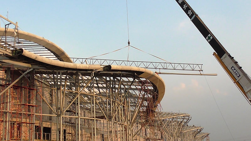 Bentuk atap yang melengkung dan proses produksi di atas tanah (rolled on ground) merupakan tantangan sewaktu lift-up.